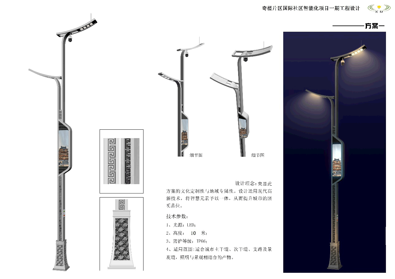 1.智慧燈桿功能模塊化:以智慧照明系統為基礎功能,可選配備WIFI熱點覆蓋功能、攝像頭模塊、充電樁功能、4G/5G信號覆蓋功能、物聯網RFID以及信息發布功能等。燈桿采用模塊化設計,各功能模塊相互獨立,預留安裝孔位、供電模塊、傳輸連接模塊等。可以根據客戶需要,按需組合、靈活配置,以適應不同的使用場景。